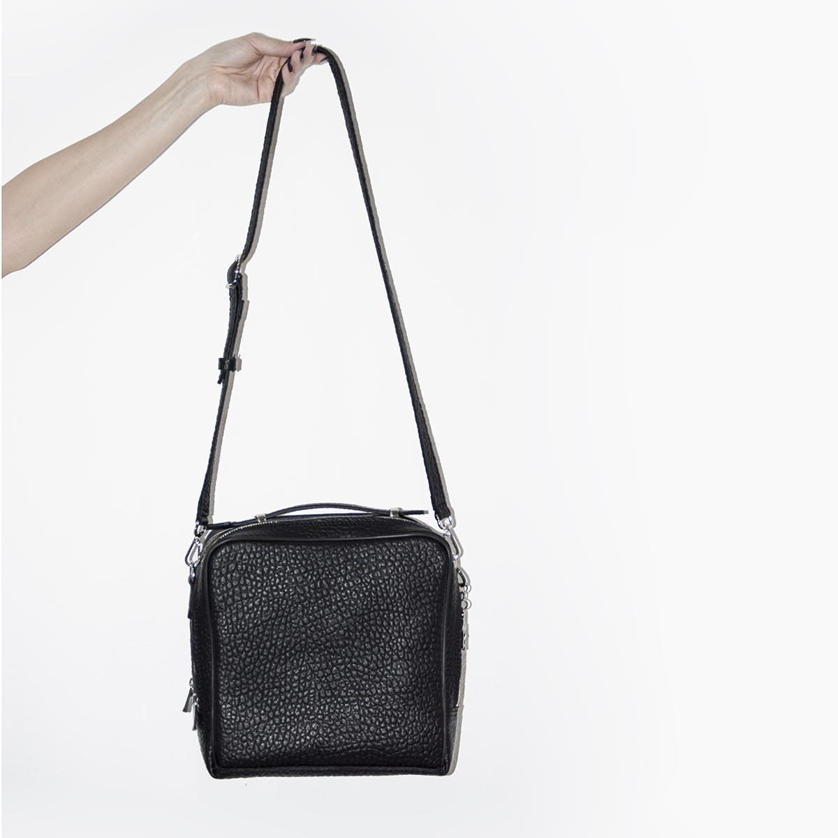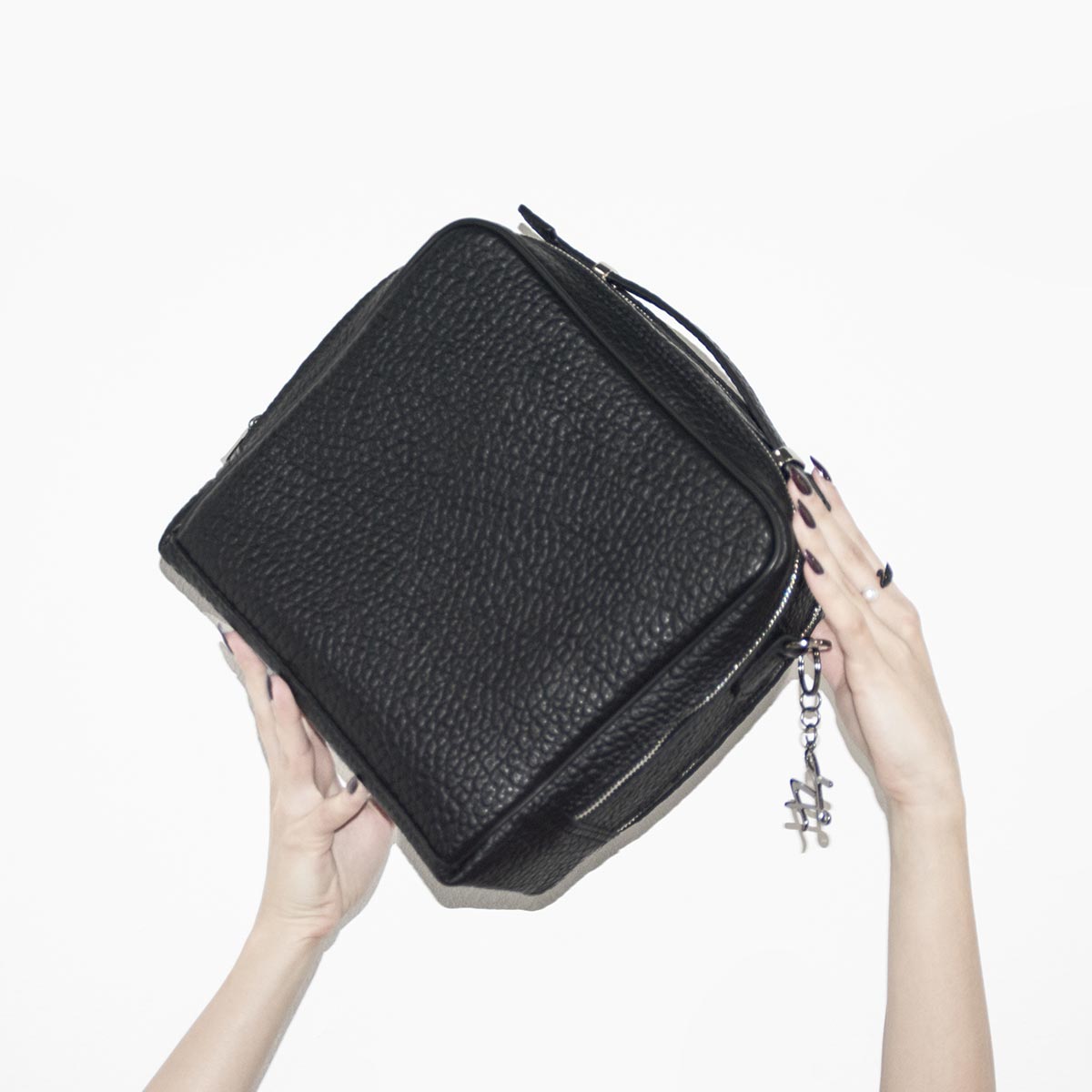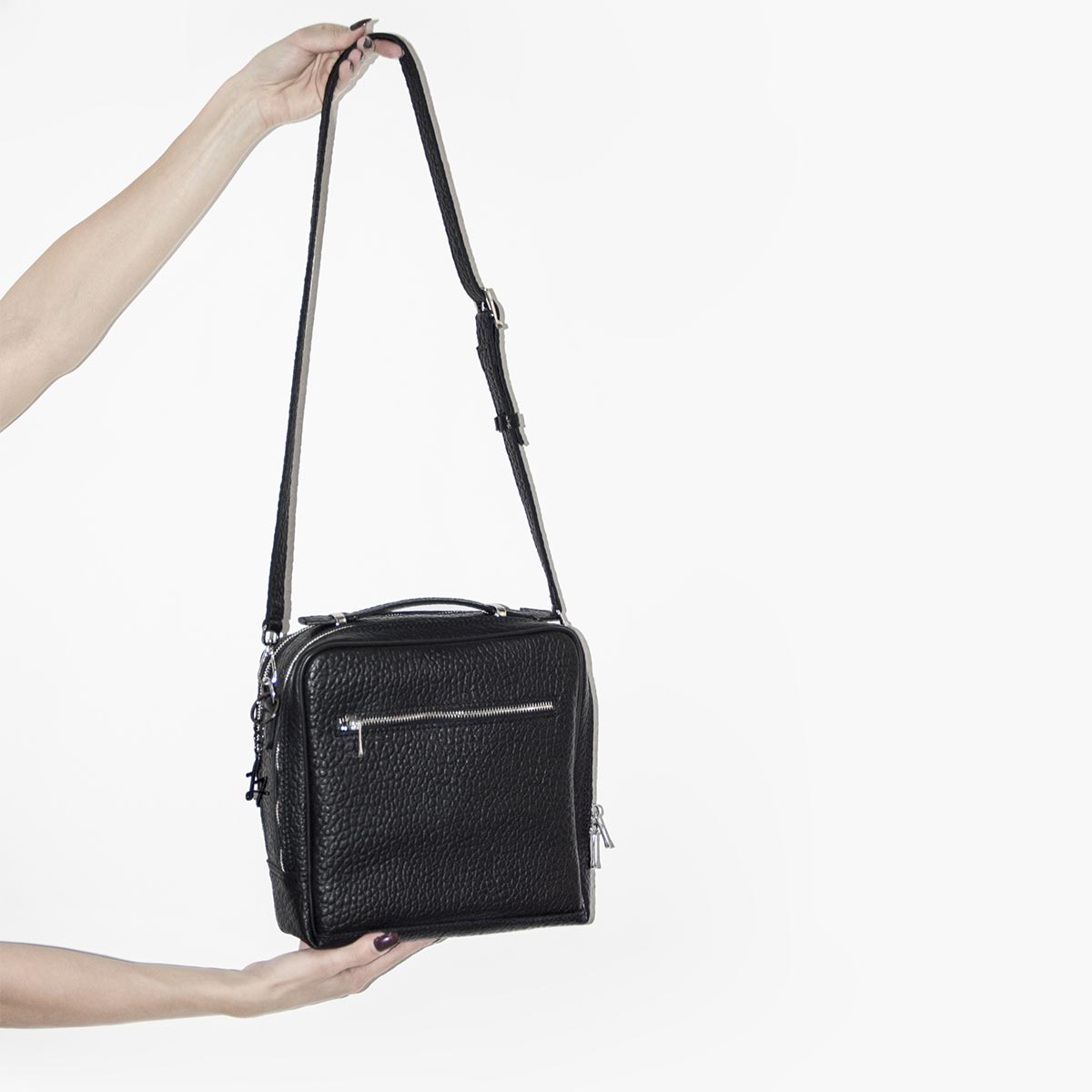 Outstanding and elegant black, square leather handbag with silver chain details. Limited edition, handmade finished and polished. Very spacious and business appropriate. Crossbody leather strap and leather handle. Captivating piece for a modern business outfits as well as for all day purposes.