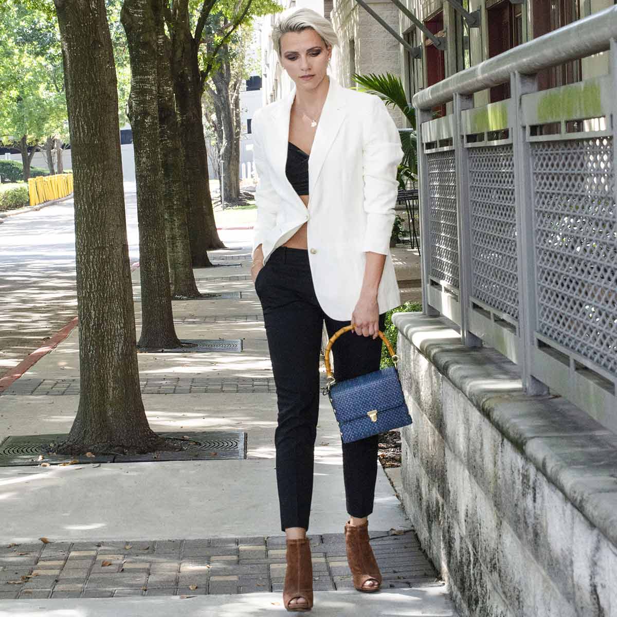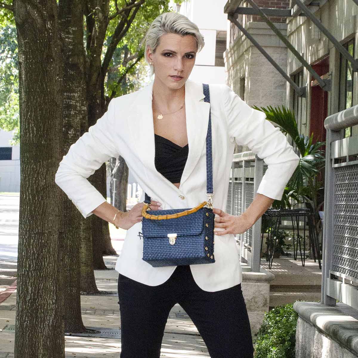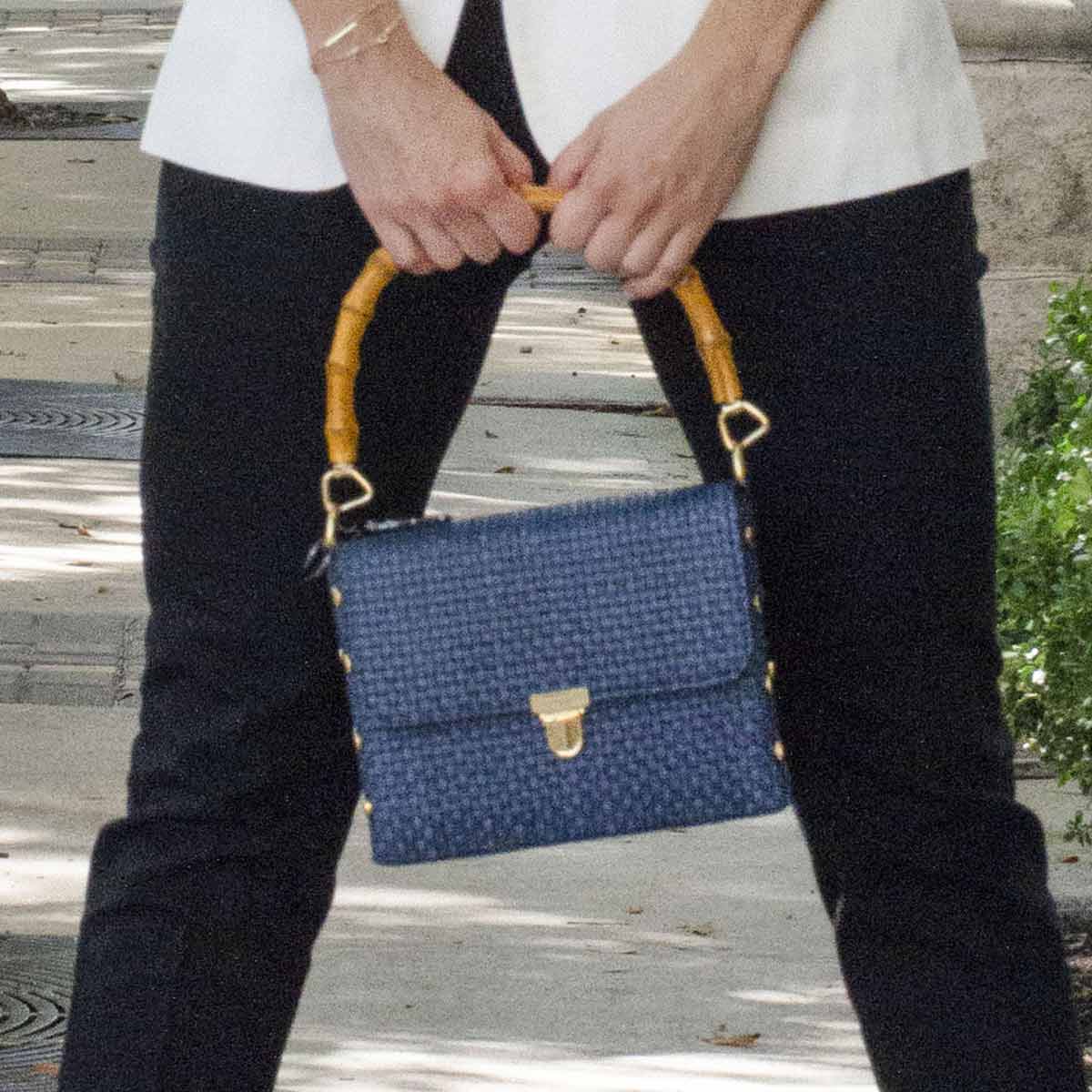 Beautiful blue woven leather handbag with a bamboo handle and a crossbody strap. Perfect piece for day and evening attire. 7”H x 9”W x 4”D