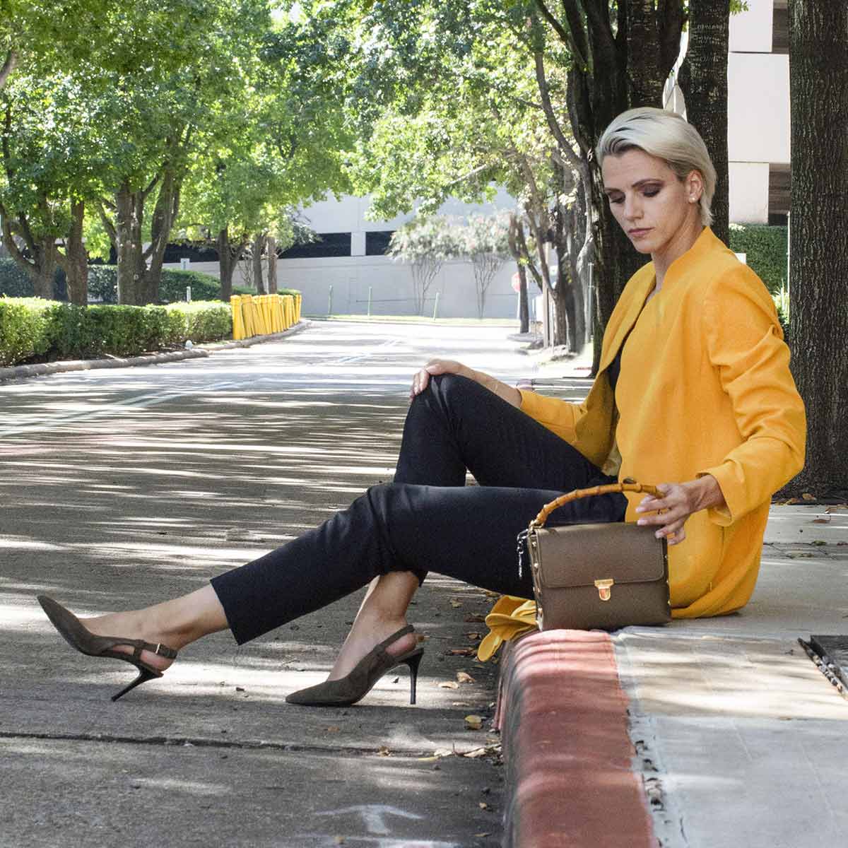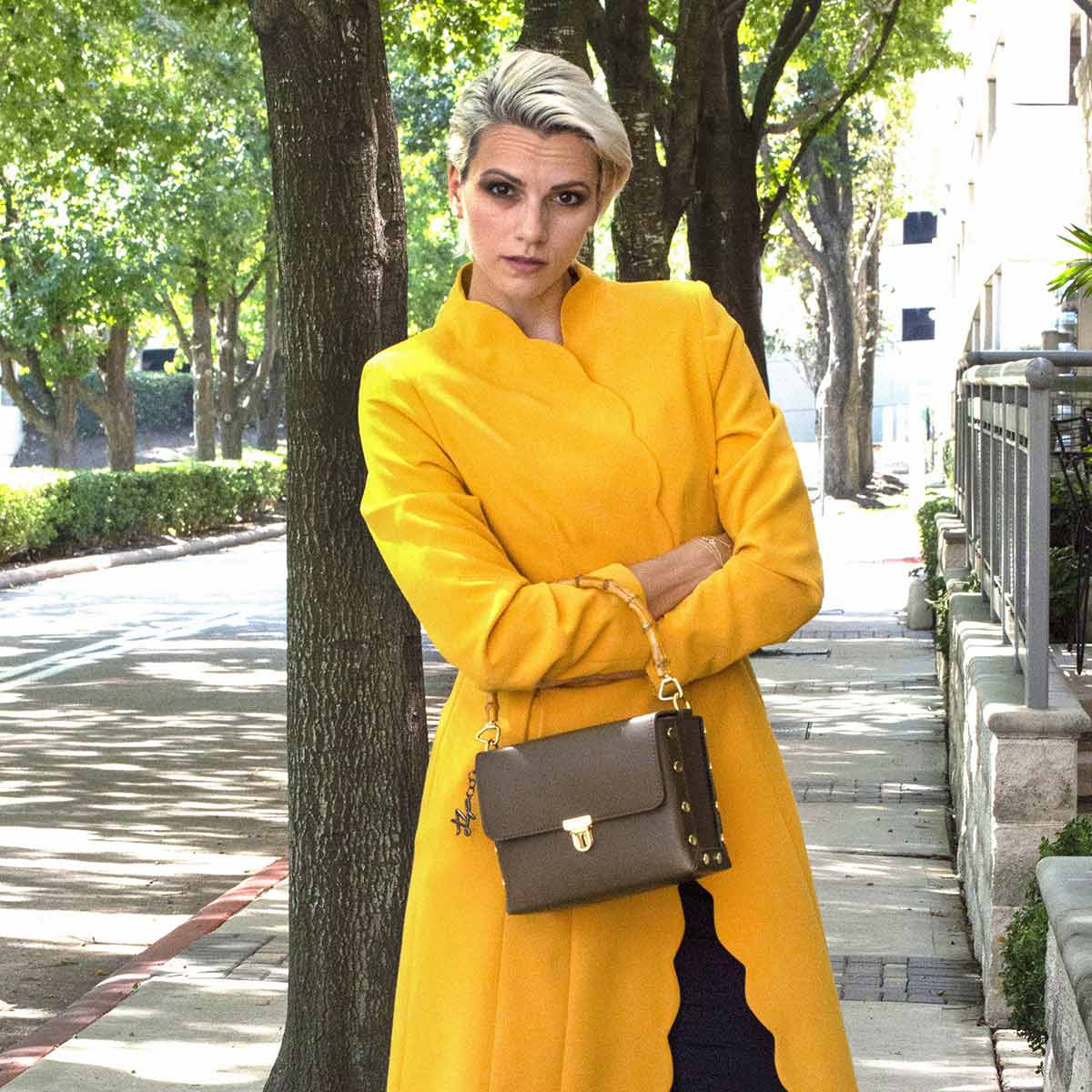 Beautiful khaki leather handbag with a bamboo handle and a crossbody strap. Amazing piece for business & casual events. Very versatile and elegant.