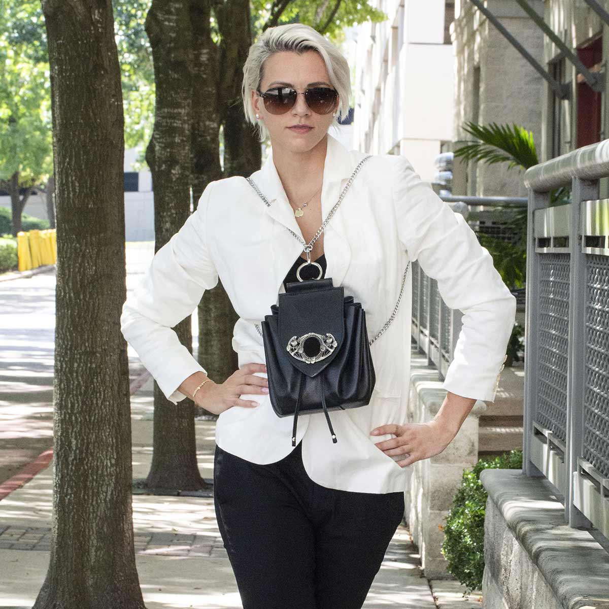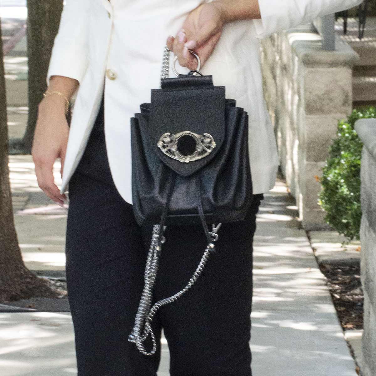 Small pouch/backpack with silver chain made of very soft black leather. Just a piece of jewelry that fits all your necessities. Perfect for day activities and easy to adapt to evening events. 10”H x 8”W x 5”D
