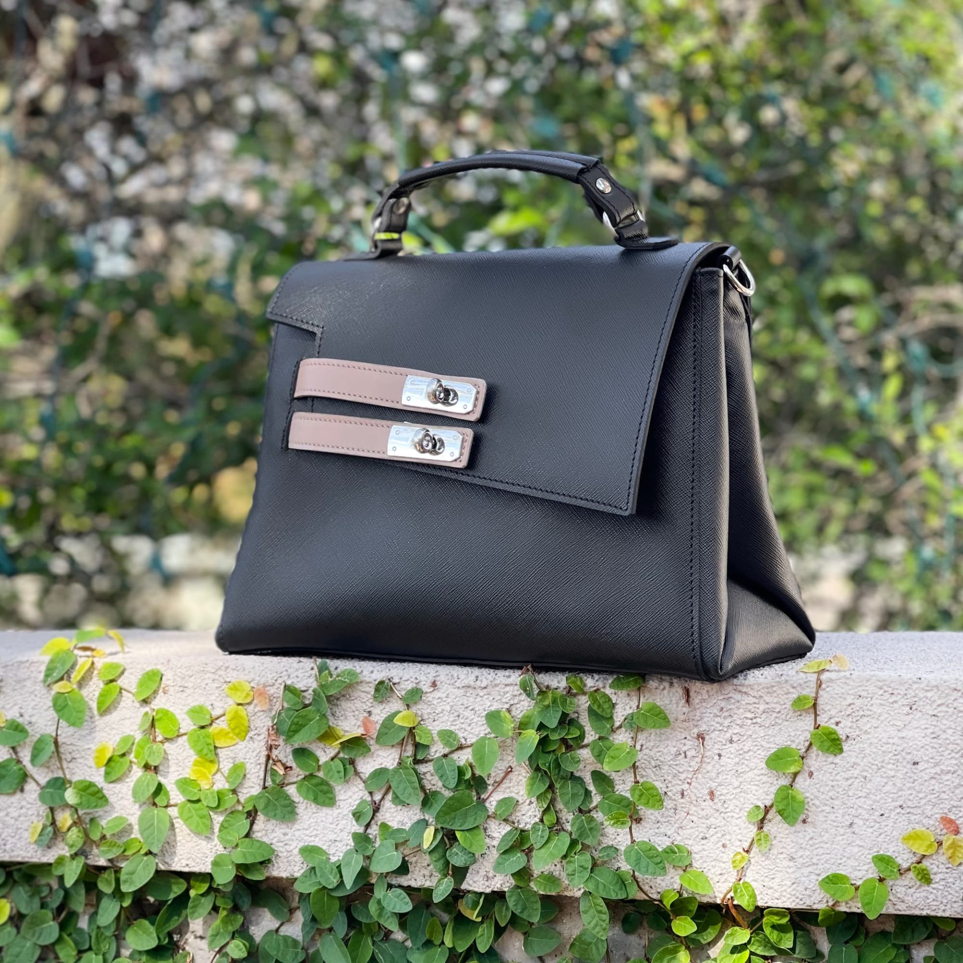 Statement piece. Suitable for every occasion. Classic black handbag with 2 nude closing straps. Both handle and crossbody strap. High quality leather.