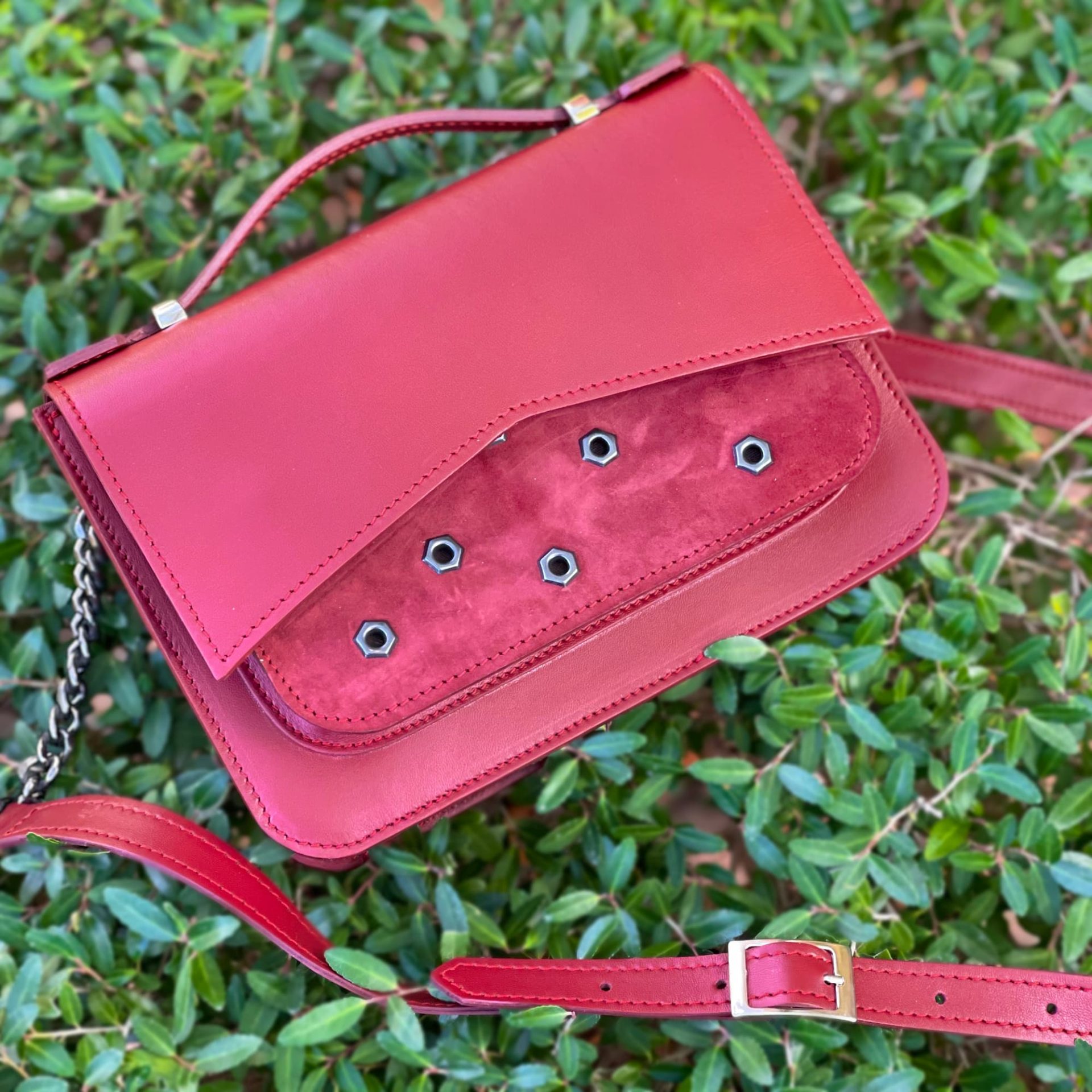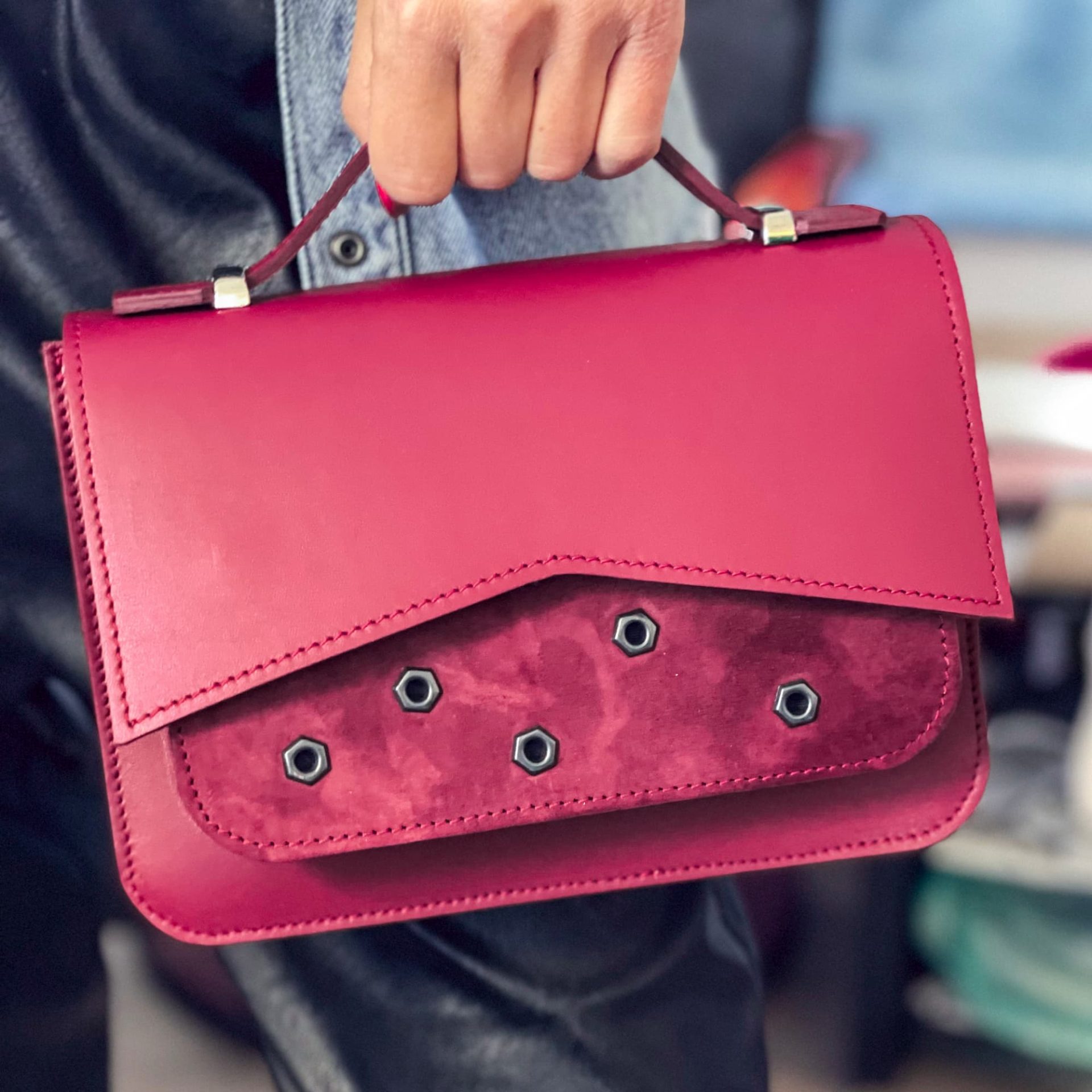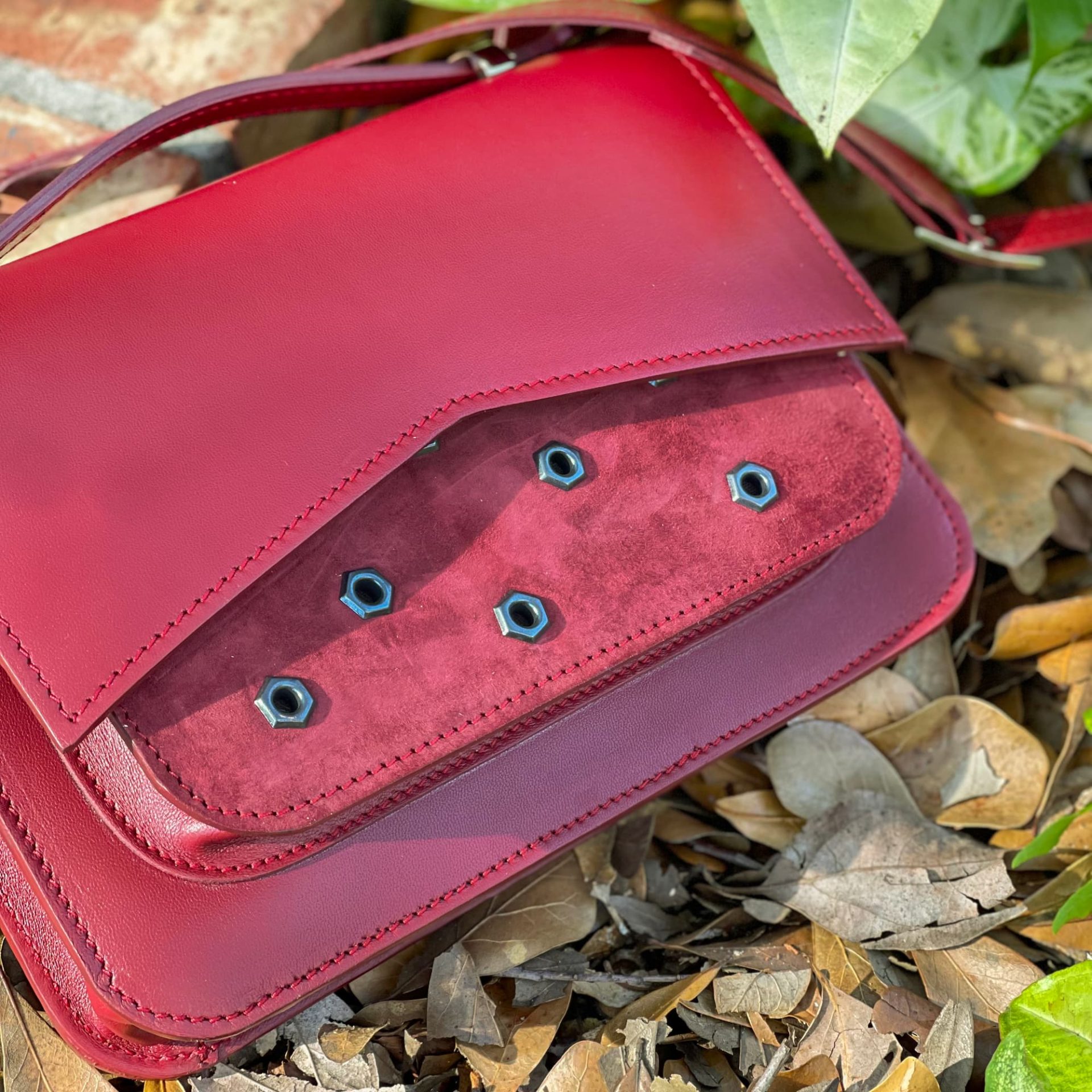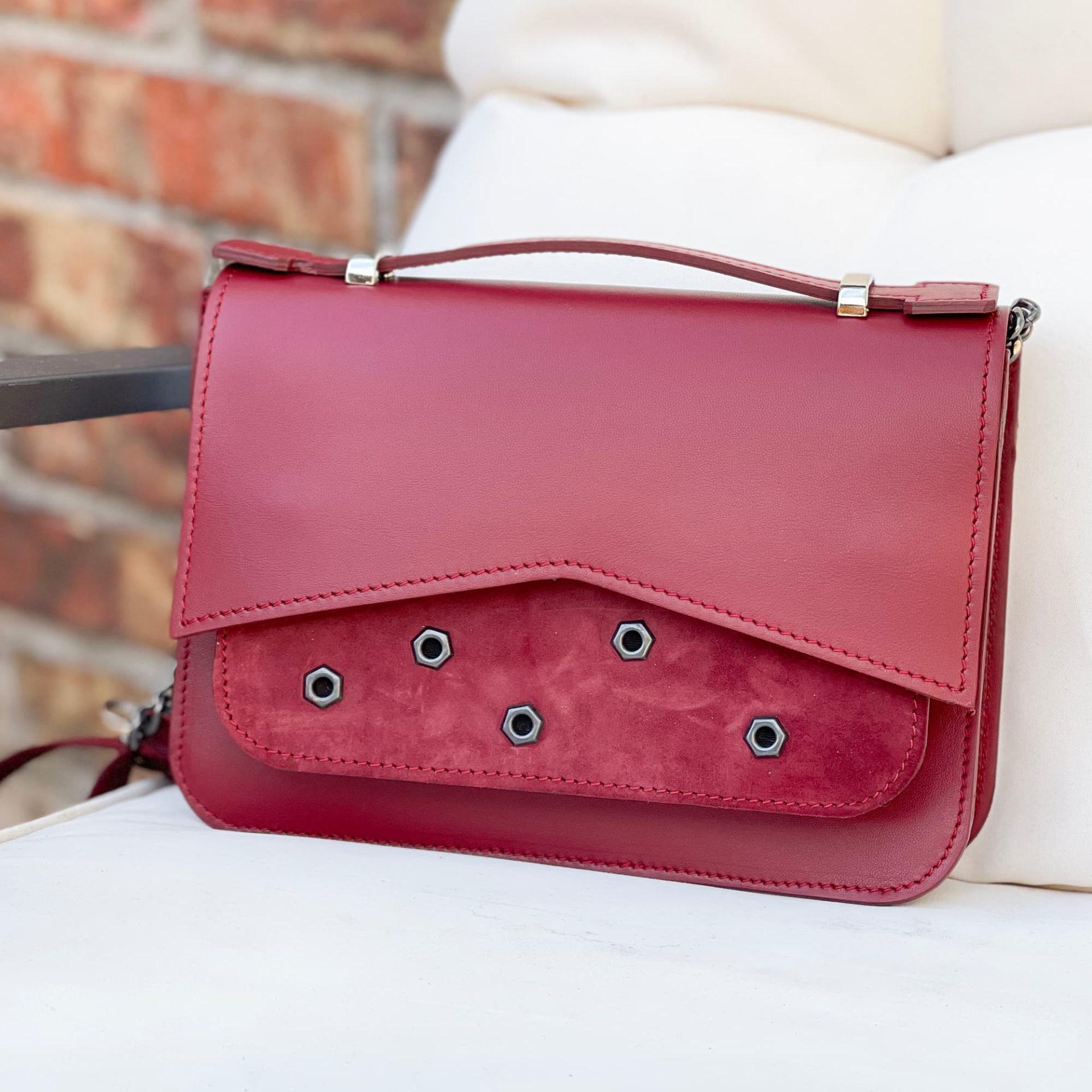 Small crossbody bag. The mix of burgundy leather and suede with metallic studs will upgrade any outfit.