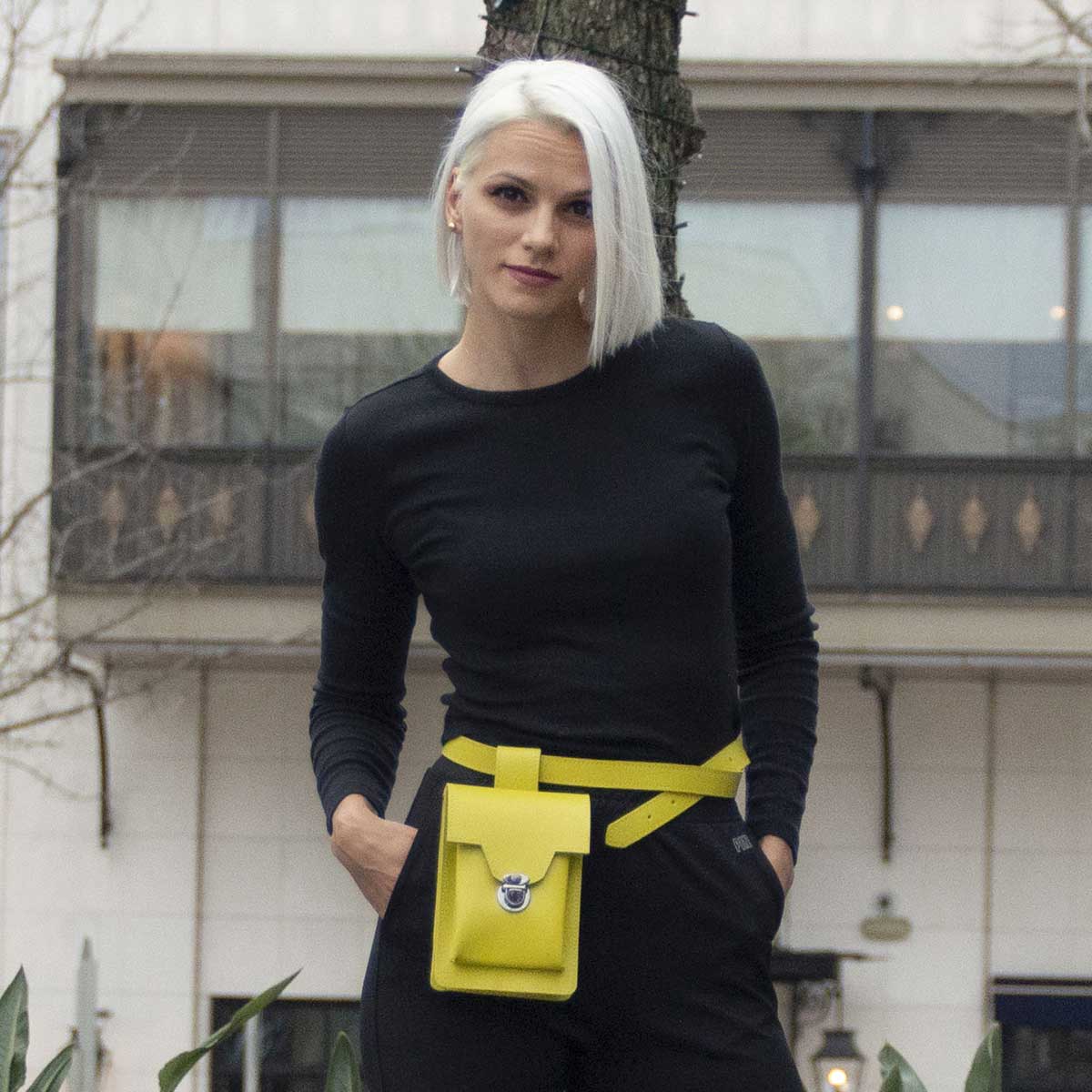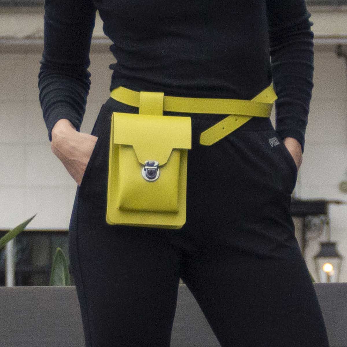 Yellow leather beltbag. It can also be used as crossbody or with personal belt. Very versatile and easy to adapt to any outfit. Incredible color statement. 7,5” x 5” x 3”